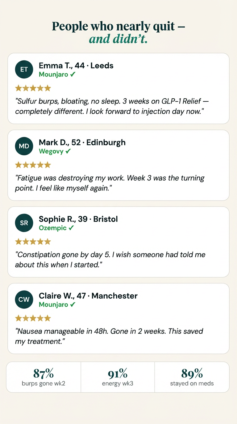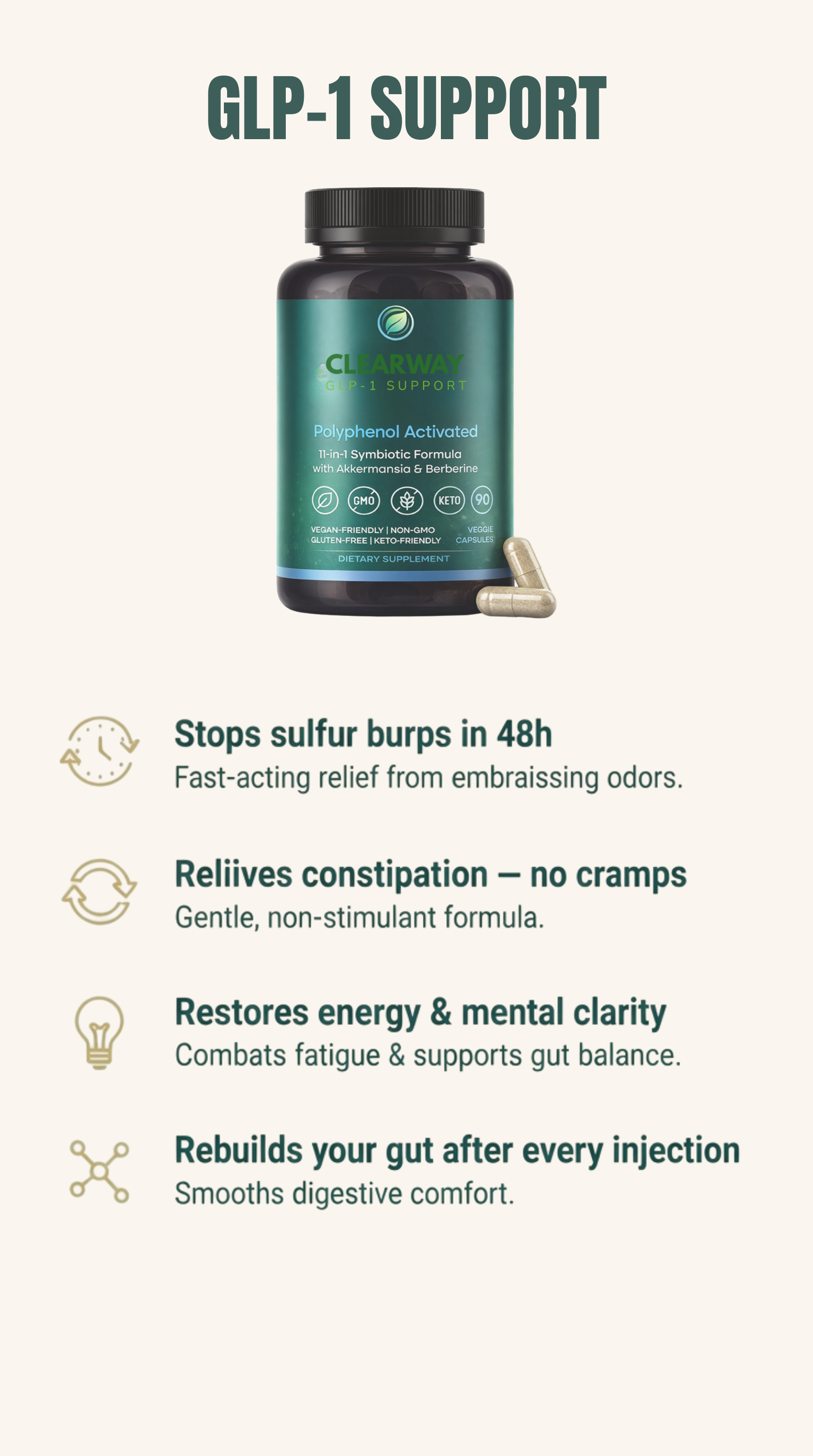 Yes. GLP-1 support is specifically formulated for all GLP-1 receptor agonist medications including Ozempic (semaglutide), Mounjaro (tirzepatide), Wegovy and Zepbound. The formula targets the specific digestive slowdown caused by this class of medication.How quickly will I see results?Why don't regular laxatives work for GLP-1 side effects?Is it safe to take alongside my GLP-1 medication?What if it doesn't work for me?